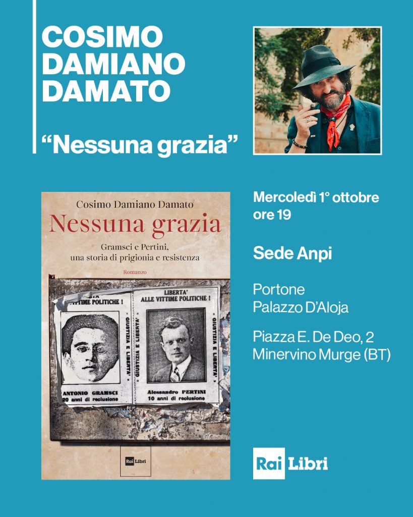 “Nessuna grazia. Gramsci e Pertini, una storia di prigionia e resistenza” di Cosimo Damiano Damato, sarà presentato mercoledì 1° ottobre alle ore 18.30 dall’autore a Minervino Murge. L’incontro si terrà a Portone Palazzo D’Aloja (piazza E. De Deo, 2).