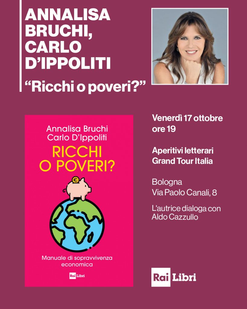 Venerdì 17 ottobre alle ore 19 a Grand Tour Italia a Bologna (via Paolo Canali 8), Annalisa Bruchi presenta “Ricchi o Poveri? Manuale di sopravvivenza economica”, scritto con Carlo D’Ippoliti. A dialogare con l’autrice è Aldo Cazzullo. Attraverso dati, approfondimenti, aneddoti, raccogliendo le testimonianze di alcuni tra i principali protagonisti della finanza e dell’industria italiane, il volume edito da Rai Libri fotografa la situazione dell’Italia in modo finalmente chiaro e comprensibile, senza sminuire né nascondere le sfide che ci attendono.