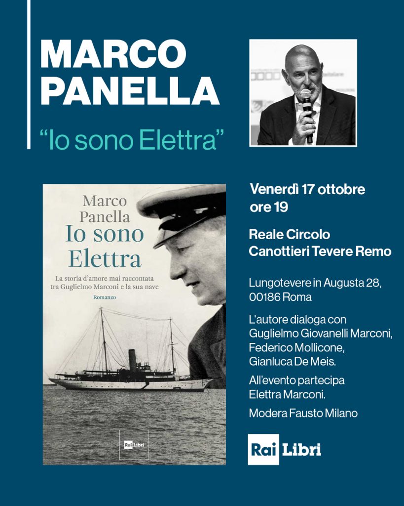 Venerdì 17 ottobre alle ore 19, il Reale Circolo Canottieri Tevere Remo (Lungotevere in Augusta, 28) ospita la presentazione di “Io sono Elettra. La storia d’amore mai raccontata tra Guglielmo Marconi e la sua nave” di Marco Panella. A dialogare con l’autore Guglielmo Giovanelli Marconi, Federico Mollicone, Gianluca De Meis. All’evento partecipa Elettra Marconi. Modera Fausto Milano. Il romanzo edito da Rai Libri accende una luce su una relazione inedita, intima e profonda tra l’inventore della radio e il panfilo Elettra, la sua amata compagna di viaggio e sperimentazione. Panella racconta la passione di Marconi per il mare e il suo legame speciale con la nave trasformata in uno strumento di ricerca e innovazione.