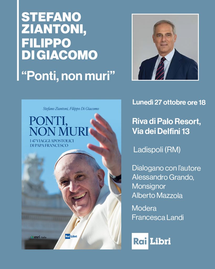 Lunedì 27 ottobre alle ore 18 Stefano Ziantoni presenta “Ponti, non muri” a Ladispoli (Riva di Palo Resort, Via dei Delfini 13). Il libro, scritto con Filippo Di Giacomo per Rai Libri, racconta i 47 viaggi apostolici di Papa Francesco, da quello in Brasile del 2013, dopo la sua elezione, in occasione della Giornata Mondiale della Gioventù, all’ultimo in Corsica, ad Ajaccio, a dicembre del 2024. Dialogano con l’autore Alessandro Grando e Monsignor Alberto Mazzola. Modera Francesca Landi.