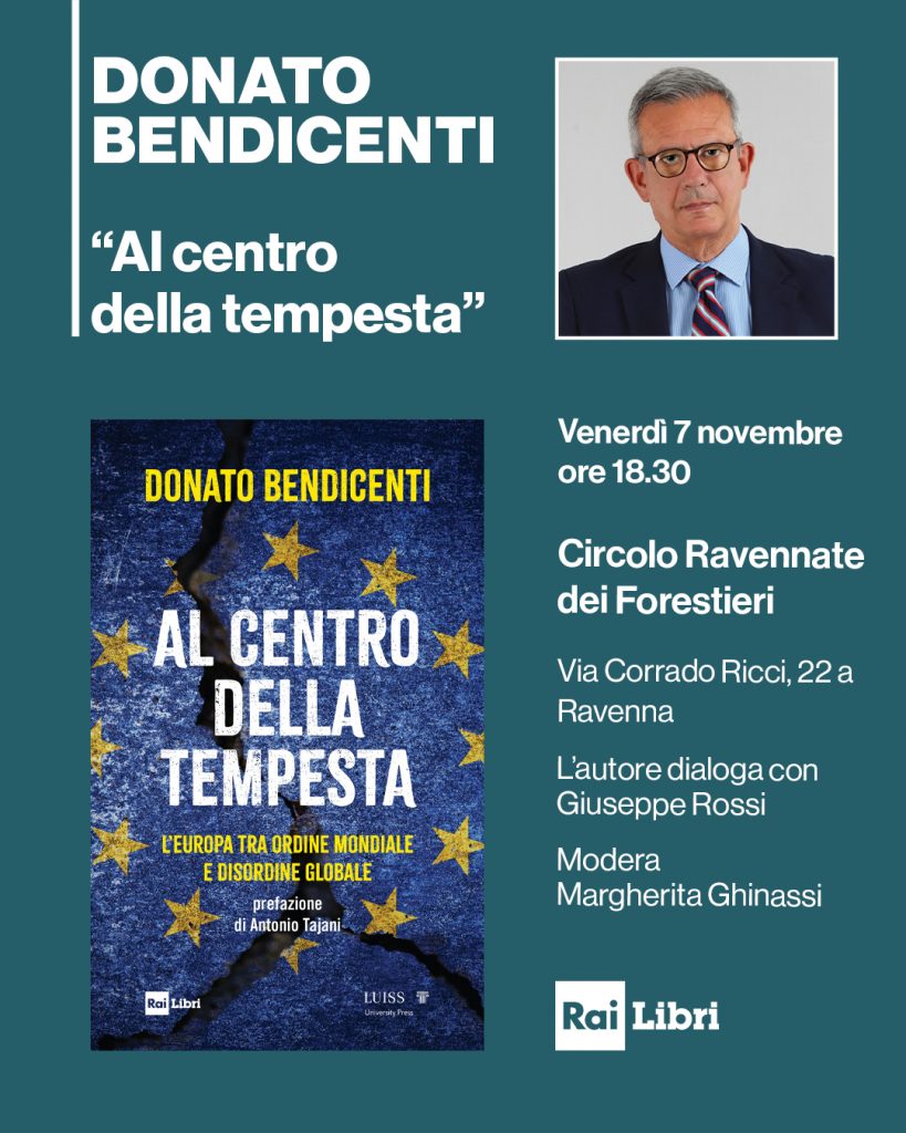 Venerdì 7 novembre alle ore 18.30 il Circolo Ravennate dei Forestieri (via Corrado Ricci, 22 a Ravenna) ospita la presentazione di “Al Centro della Tempesta. L’Europa tra ordine mondiale e disordine globale” di Donato Bendicenti, edito da Rai Libri. A dialogare con l’autore Giuseppe Rossi, modera Margherita Ghinassi. Il volume racconta come l’Unione debba confrontarsi con i nuovi scenari internazionali, nuovi equilibri, maggioranze variabili, rotte alternative sulle quali navigare verso il futuro.