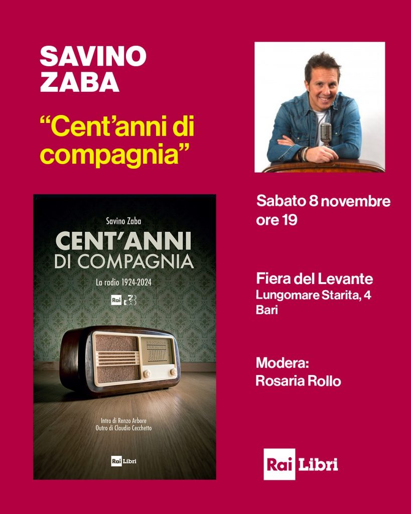 Sabato 8 novembre alle ore 19 Savino Zaba presenta “Cent’anni di compagnia. La radio 1924-2024” alla Fiera del Levante di Bari (Lungomare Starita, 4). Edito da Rai Libri, il volume è un viaggio nella storia della radio: dalle prime trasmissioni dell’URI negli anni Venti fino all’esplosione delle emittenti locali e all’ingresso nell’era digitale. Modera l’incontro con l’autore Rosaria Rollo.