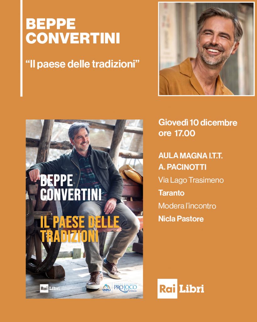 Mercoledì 10 dicembre alle ore 17 Beppe Convertini presenta “Il Paese delle tradizioni” all’Aula Magna dell’Istituto Tecnico Tecnologico Antonio Pacinotti di Taranto (Via Lago Trasimeno). A moderare l’incontro, Nicla Pastore. Il volume, edito da Rai Libri, è un viaggio lungo lo Stivale, che conduce il lettore alla scoperta di sagre paesane, feste religiose, riti antichi, senza dimenticare la tavola e l’artigianato.