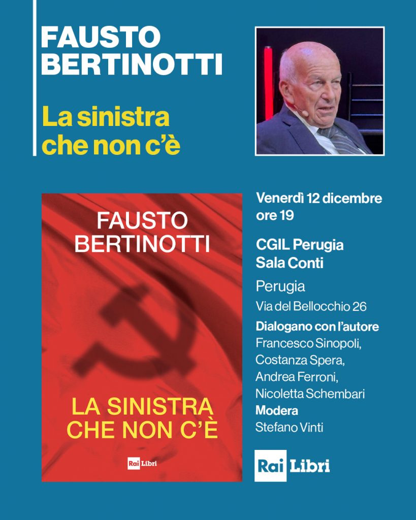 Venerdì 12 dicembre alle 17 Fausto Bertinotti presenta “La sinistra che non c’è” nel capoluogo umbro. A ospitare l’incontro con il pubblico, la Sala Conti della CGIL di Perugia (Via del Bellocchio 26). A dialogare con l’autore Francesco Sinopoli, Costanza Spera, Andrea Ferroni, Nicoletta Schembari. Modera Stefano Vinti. Il volume, edito da Rai Libri, racconta, dalla prospettiva di un protagonista e di un osservatore in prima linea, la parabola della sinistra contemporanea.