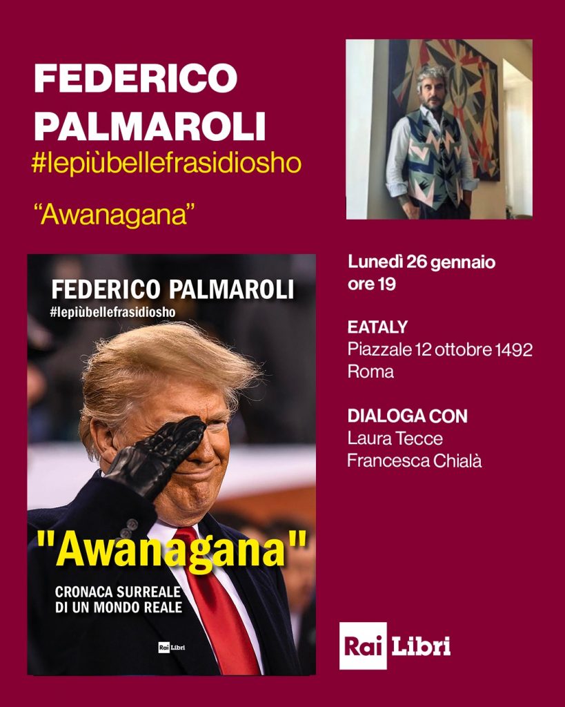Un viaggio comico dentro il 2025. Lunedì 26 gennaio alle ore 19.00 Federico Palmaroli #lepiùbellefrasidioshopresenta “Awanagana. Cronaca surreale di un mondo reale” edito da Rai Libri a Roma. A ospitare l’incontro con il pubblico sarà Eataly (Piazzale 12 Ottobre 1492). A dialogare con l’autore Laura Tecce e Francesca Chialà. Tra foto, battute e personaggi reali ma assurdi, Palmaroli firma la sceneggiatura non ufficiale dell’anno appena vissuto, in cui il mondo ha continuato a inciampare tra crisi globali, guerre, elezioni surreali e un diluvio di retorica digitale.