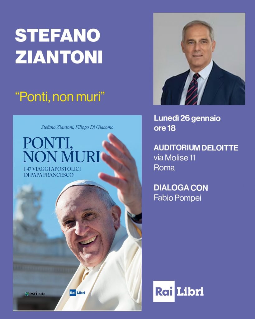 Lunedì 26 gennaio alle ore 18.00 Stefano Ziantoni presenta “Ponti, non muri” scritto con Filippo Di Giacomo all’Auditorium Deloitte a Roma (via Molise 11). A dialogare con l’autore, Fabio Pompei. Il volume, edito da Rai Libri, ripercorre i 47 Viaggi Apostolici che Papa Francesco ha compiuto fuori dall’Italia dal 2013, in occasione della Giornata Mondiale della Gioventù. Un peregrinare mosso dal profondo desiderio di stare vicino alle persone, indipendentemente dalla loro appartenenza geografica. Dialogo interreligioso, ecumenismo, ricerca della pace: Francesco ha riaffermato la volontà di diffondere questi principi ovunque si sia recato, senza mai fermarsi, nonostante le sue precarie condizioni di salute.