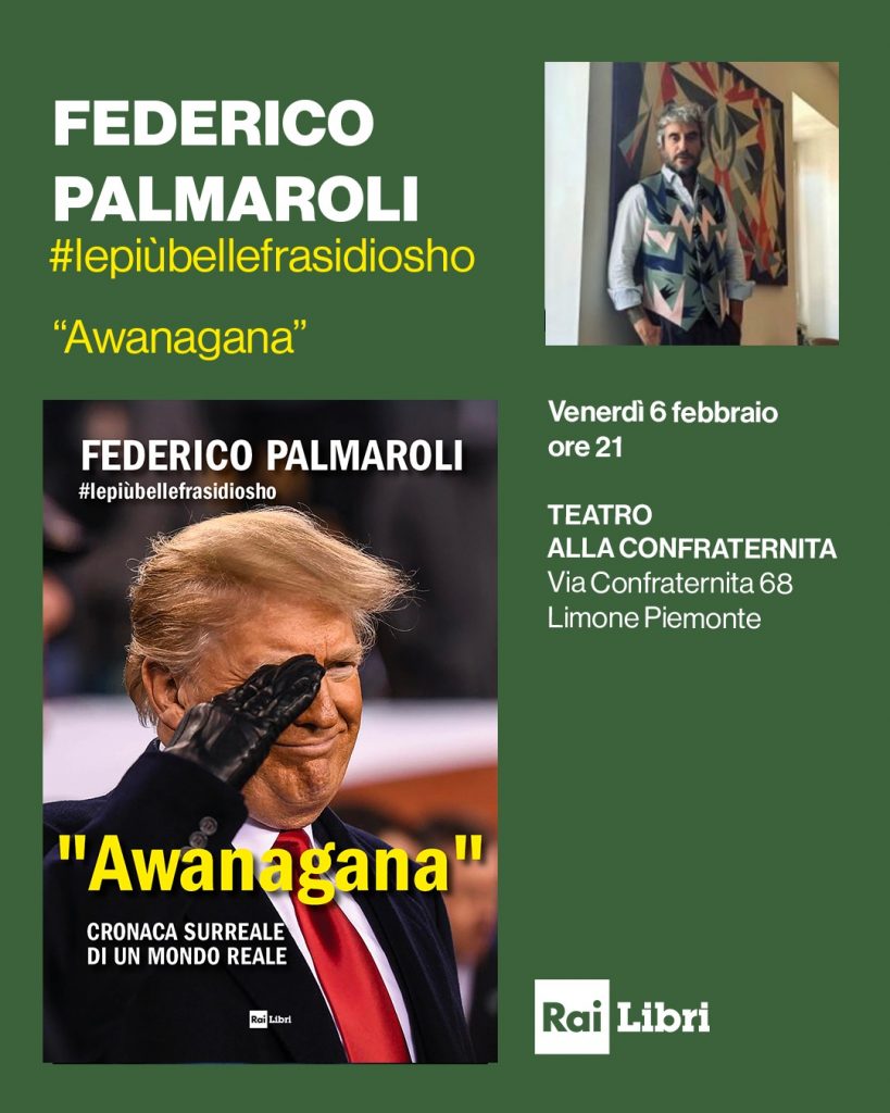 Venerdì 6 febbraio alle ore 21 Federico Palmaroli #lepiùbellefrasidiosho presenta ““Awanagana. Cronaca surreale di un mondo reale” a Limone Piemonte. A ospitare l’incontro con il pubblico, il Teatro Alla Confraternita (Via Confraternita 68). Il volume, edito da Rai Libri, accompagna il lettore in un viaggio comico dentro il 2025, attraverso foto, battute e personaggi reali ma assurdi, l’autore firma la sceneggiatura non ufficiale dell’anno appena vissuto.
