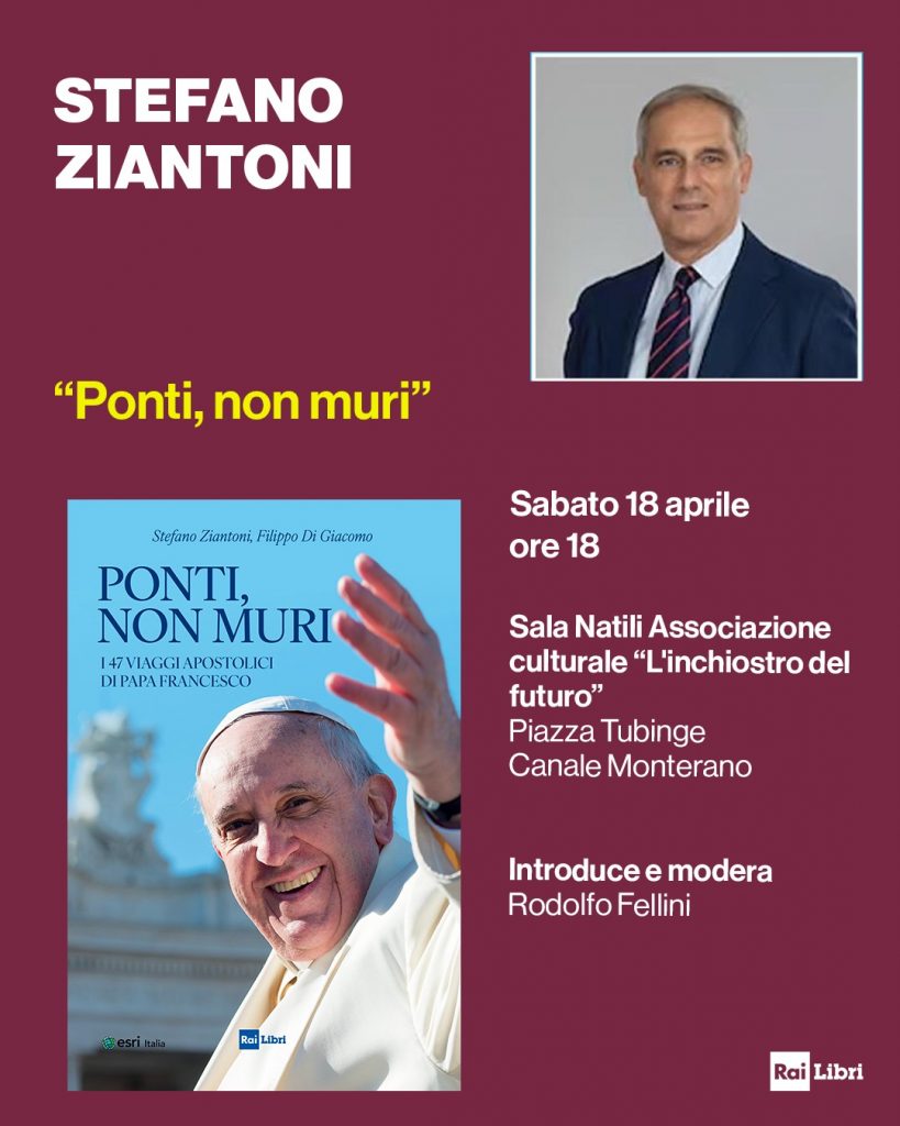 Sabato 18 aprile Stefano Ziantoni presenta “Ponti non muri. I 47 viaggi apostolici di Papa Francesco” scritto con Filippo Di Giacomo a Canale Monterano (Roma). A introdurre e moderare l’incontro pubblico con l’autore, che si terrà presso la sala Natili in piazza Tubingen, è Rodolfo Fellini. Il volume, edito da Rai Libri, testimonia il profondo desiderio di Francesco di stare vi­cino alle persone, indipendentemente dal­la loro appartenenza geografica. Alle autorità, alla società civile, ai giovani, Bergoglio ha ribadito con energia che la Chiesa è forte se costruisce ponti, non se alza muri.